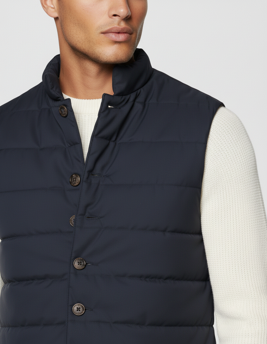Mit höchster Präzision und Liebe zum Detail gefertigt, vereint unsere gesteppte Weste zeitlose Eleganz mit funktionaler Raffinesse. In Portugal aus den feinsten Materialien hergestellt, besticht sie durch eine wasserverstärkte Knopfleiste, einen dezent gerippten Kragen und eine klare, moderne Silhouette. Das Ergebnis ist ein stilvoller Begleiter für jeden Tag – langlebig, edel und bis ins kleinste Detail perfektioniert.